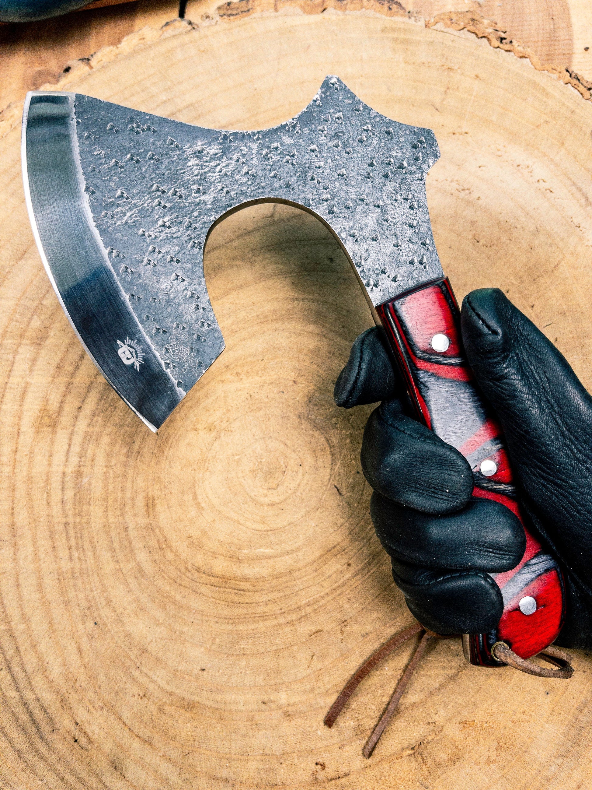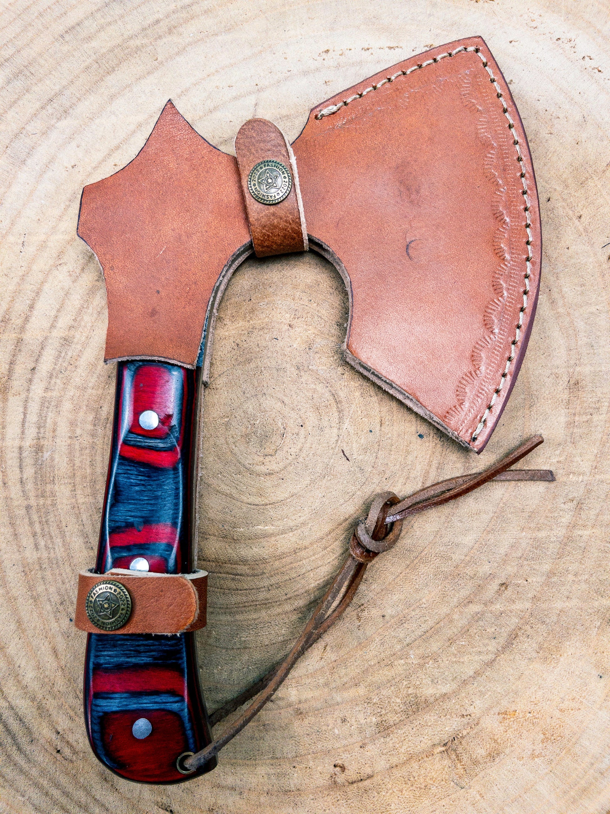 This axe is hand forged in 1095 steel, perfect for throwing or small hatchet work. Great size for backpacking / packing / hiking. Black Leather handle wrap.
