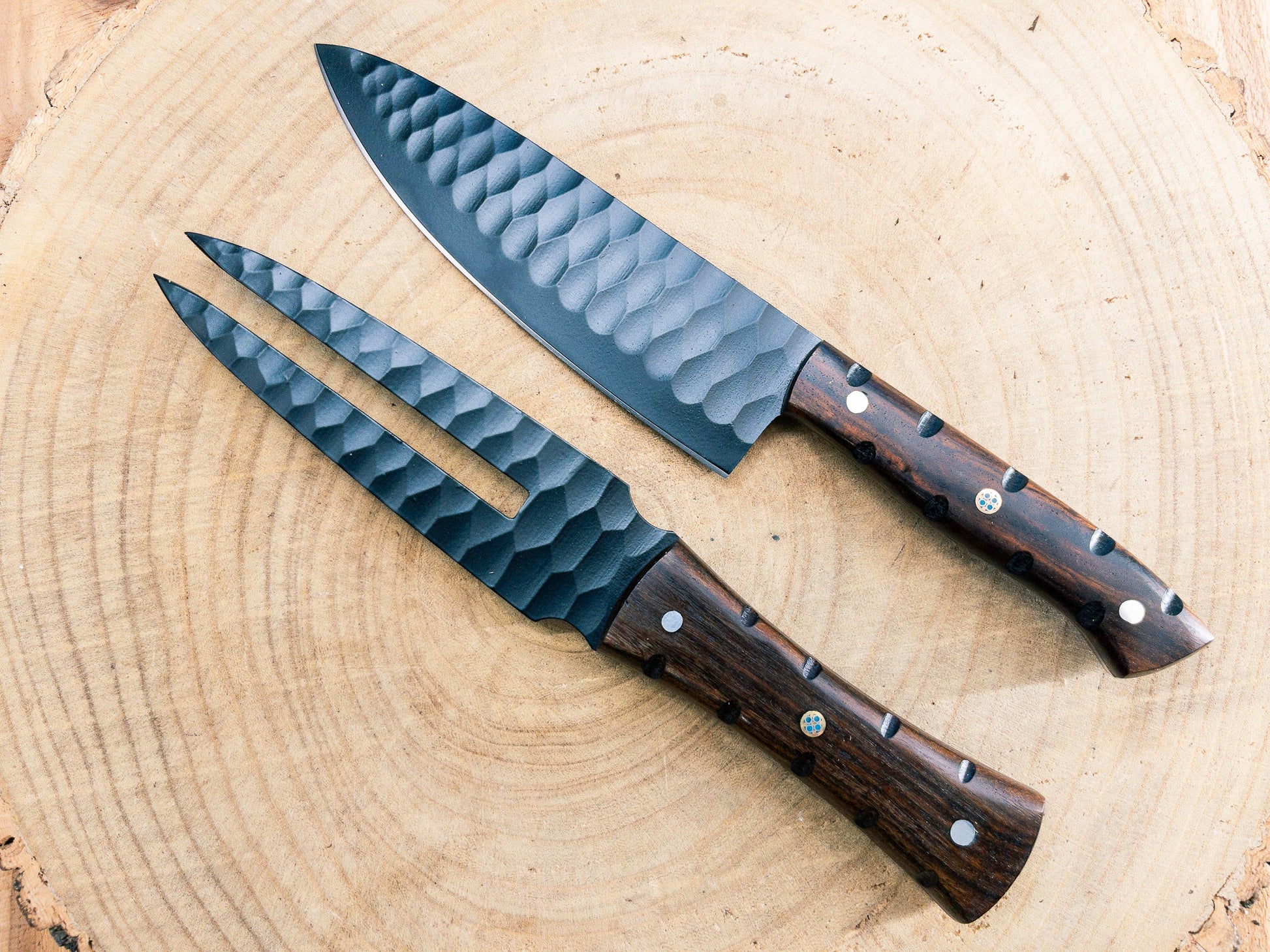 Made from 1095 steel set on rosewood handles, with a black powdercoat finish.