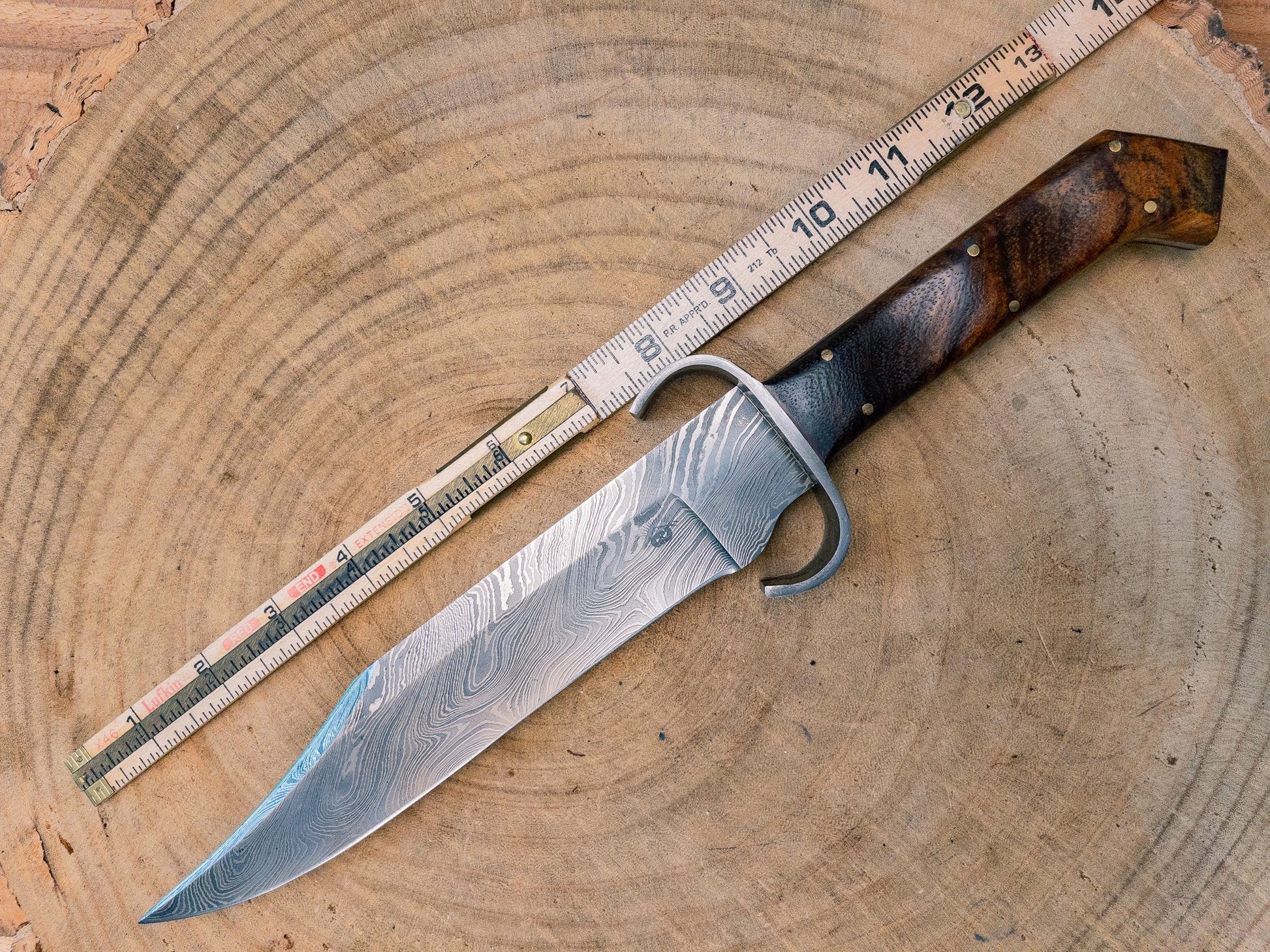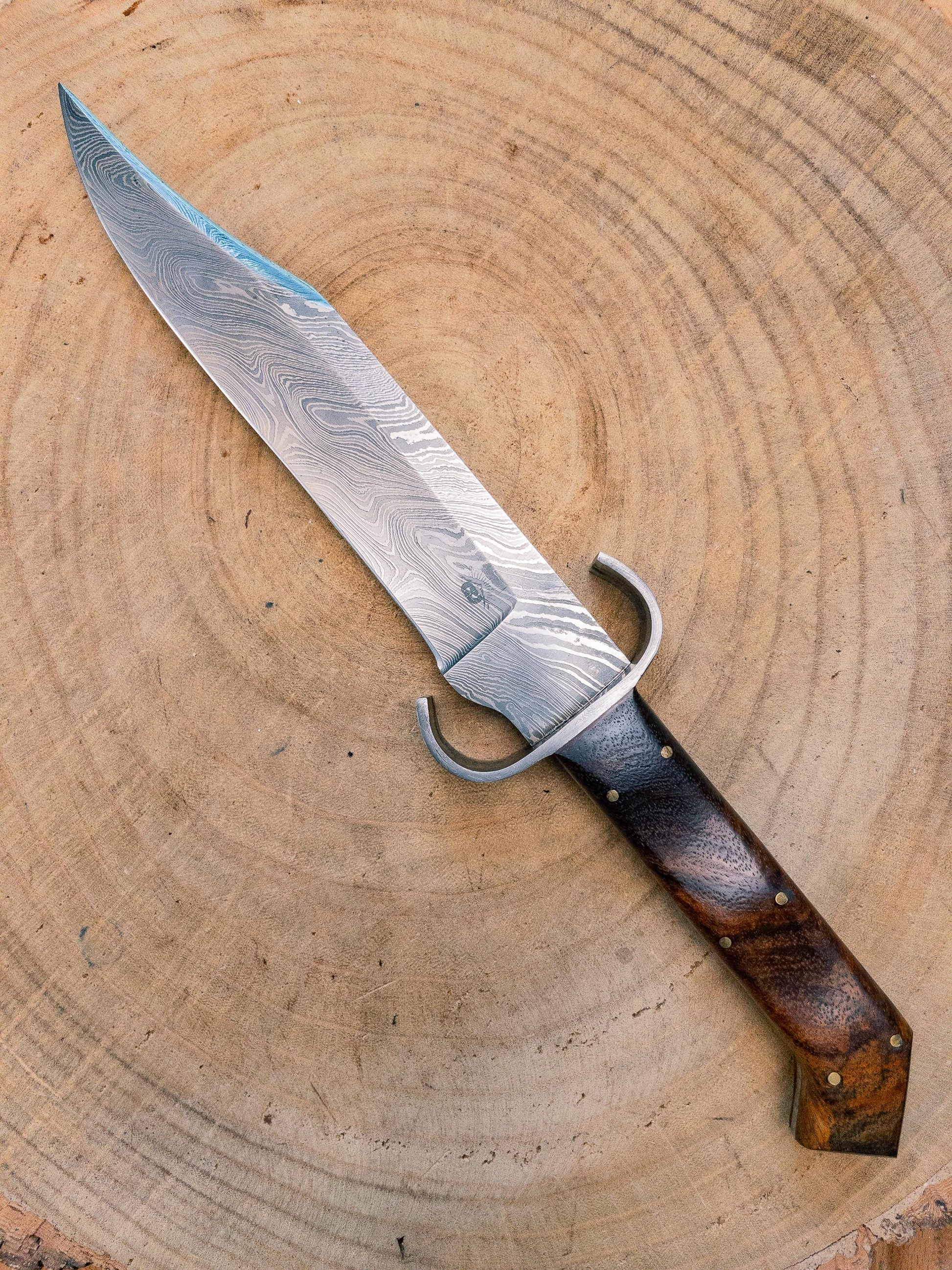 Overall Length of 13.5". 8" Blade and 5.5" birds head shaped rosewood handle with thumb/palm rest. "U" shaped damascus steel crossguard and Spanish Notch above the guard.