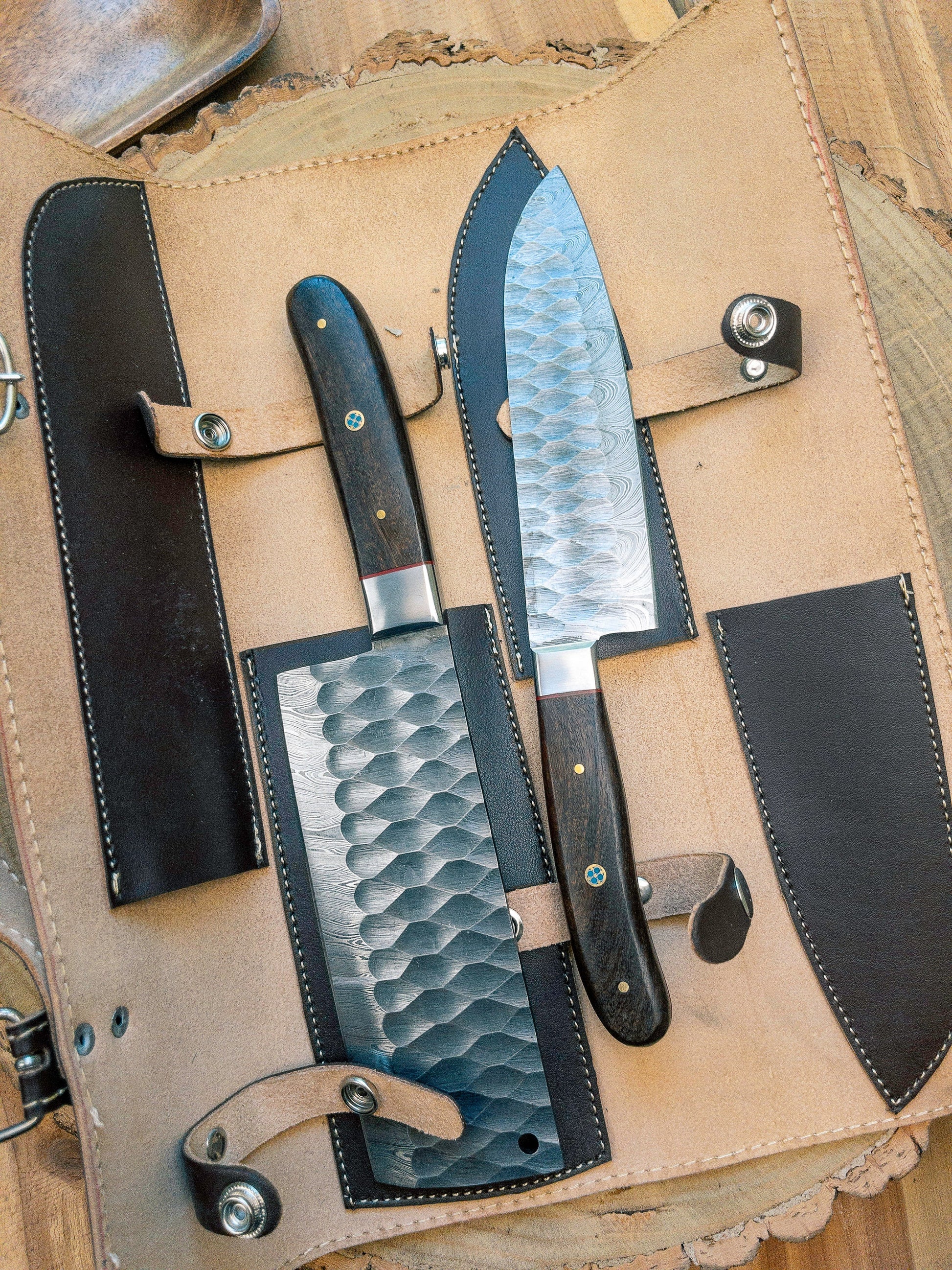 Beautiful 4 Piece Damascus Fire Chef Set, complete with custom leather chef's roll carrying case.