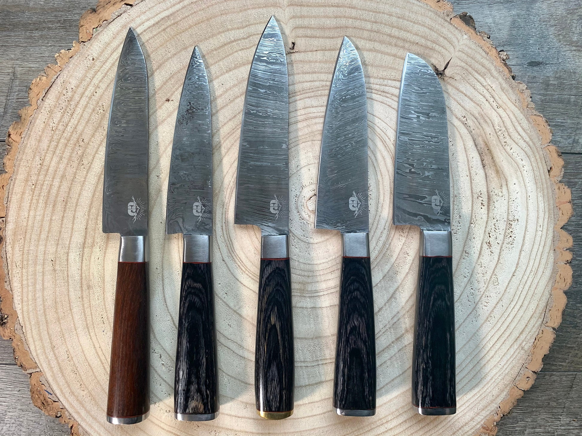Each knife is hand forged Damascus Steel in Fire Pattern, with razor sharpened cutting edges. One handle in Rosewood and others black wood pattern resin with steel bolsters bolsters.