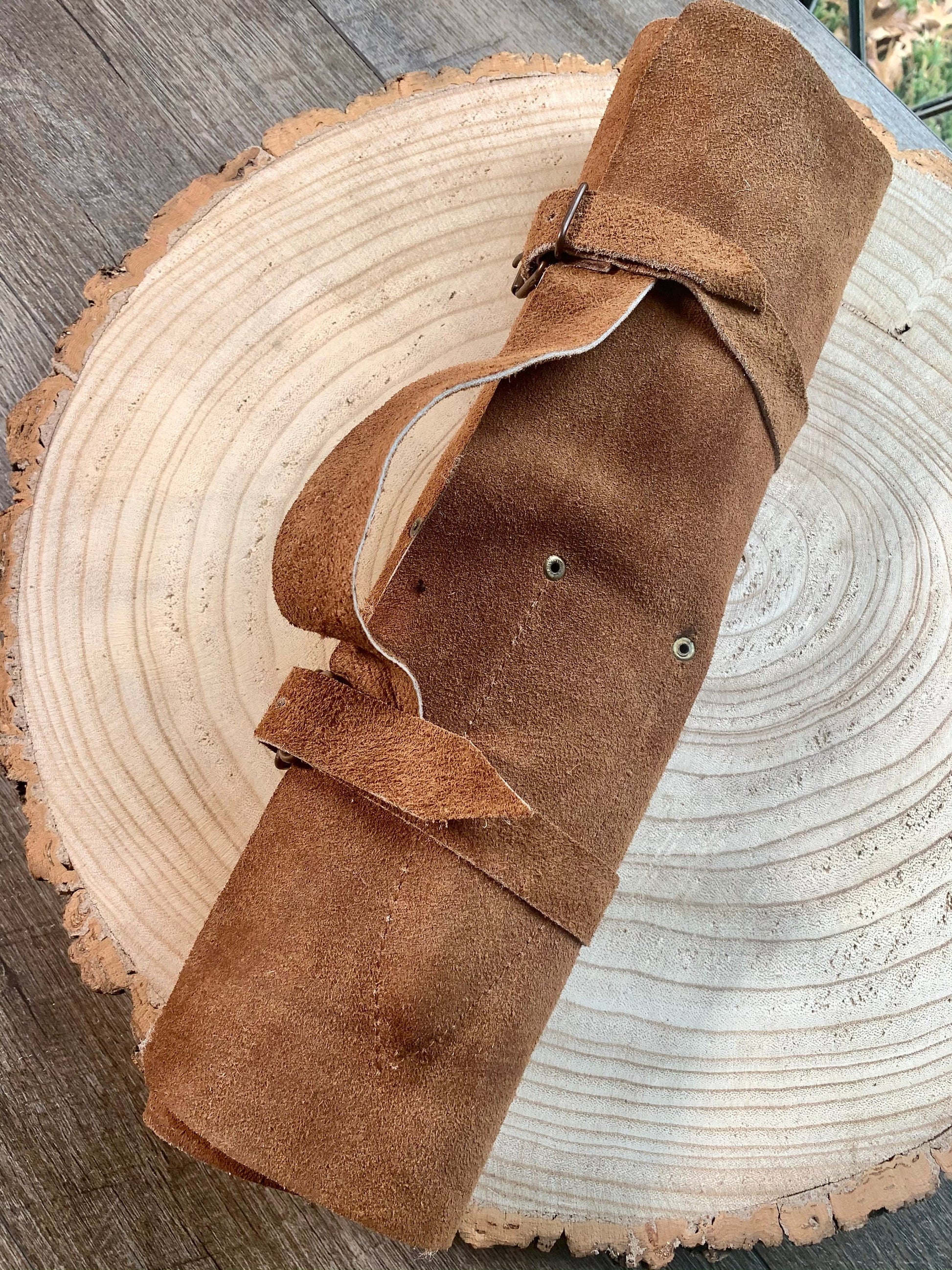 Beautiful 5 Piece Damascus Fire Chef Set, complete with custom leather chef's roll carrying case.