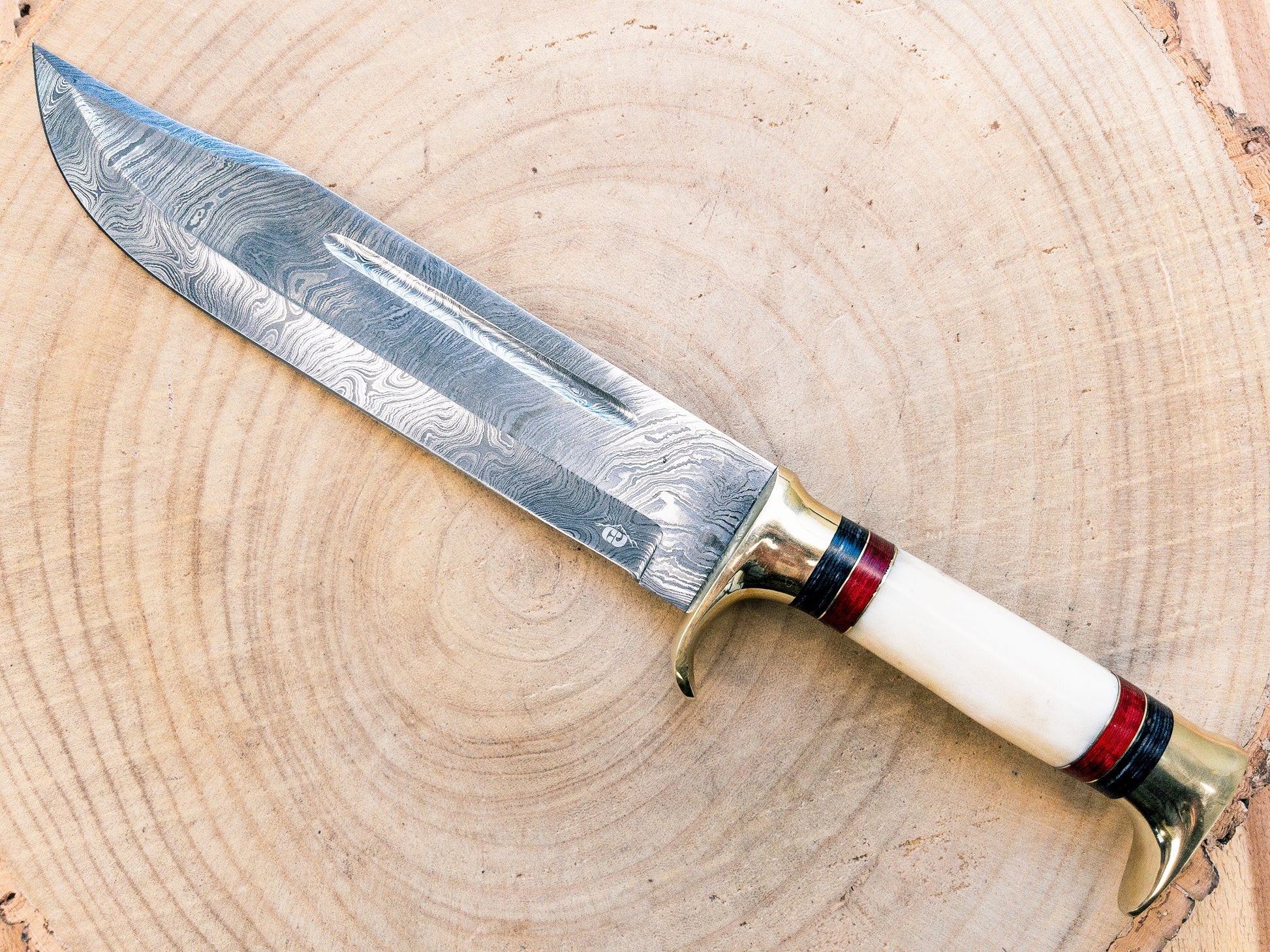 Damascus Bone 'n Brass - Bowie Hunting Knife / Bone Handle / Leather Sheath