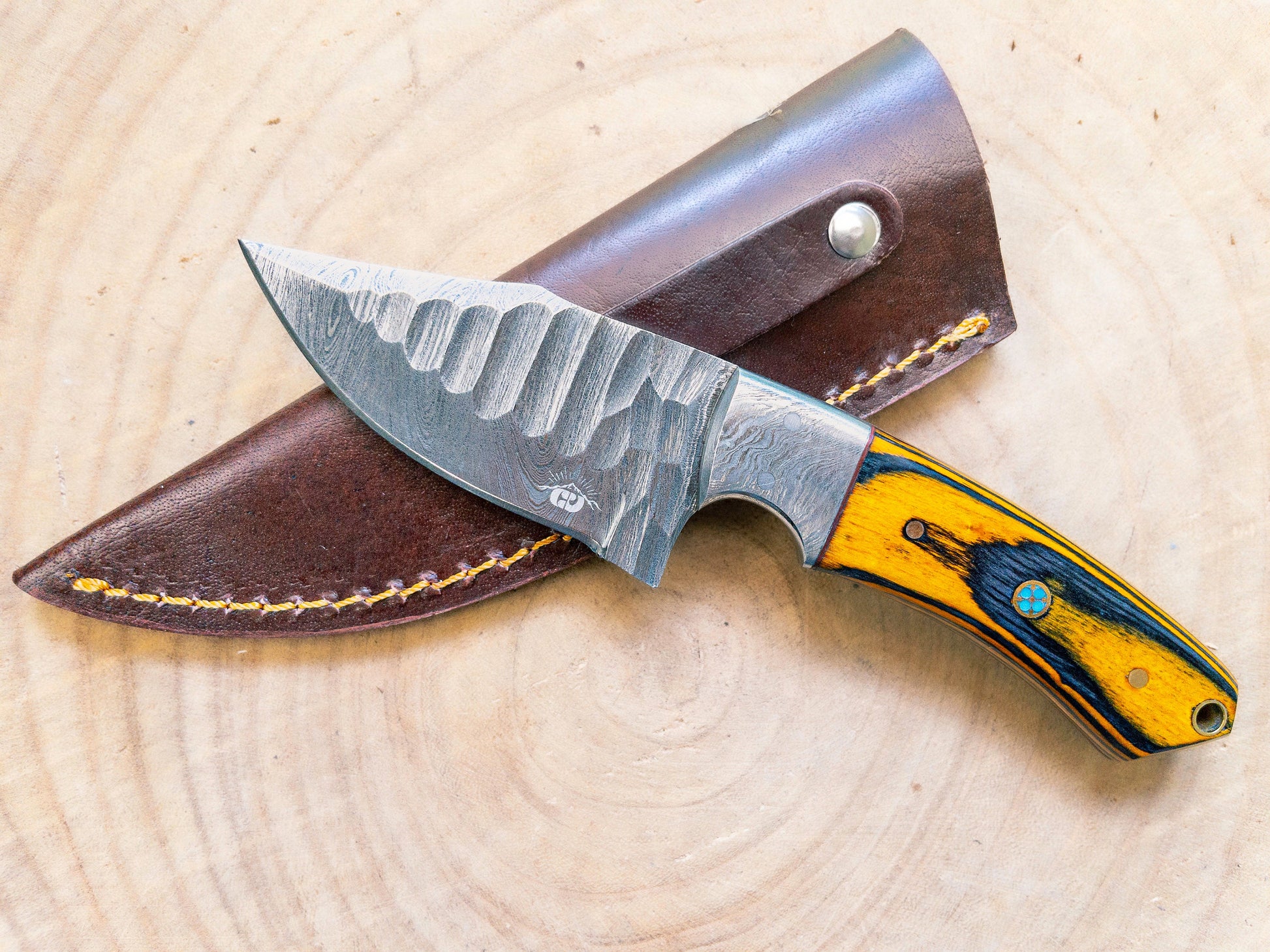 Damascus Hunting Knife, Rustic Hand Textured Blade, Orange and Black Carved Handle
