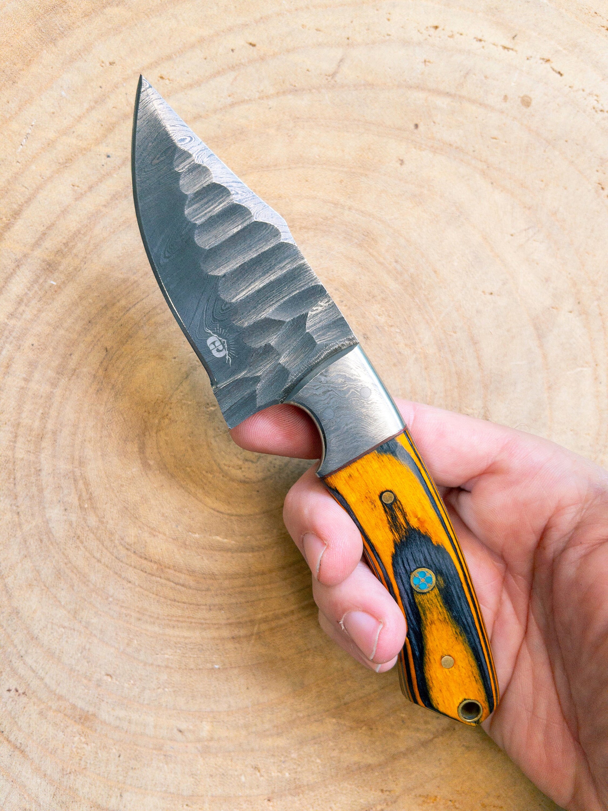 Damascus steel utility / hunting / EDC knife with damascus steel blade, rustic blade texturing, held on an orange and black wood handle and Damascus Bolster