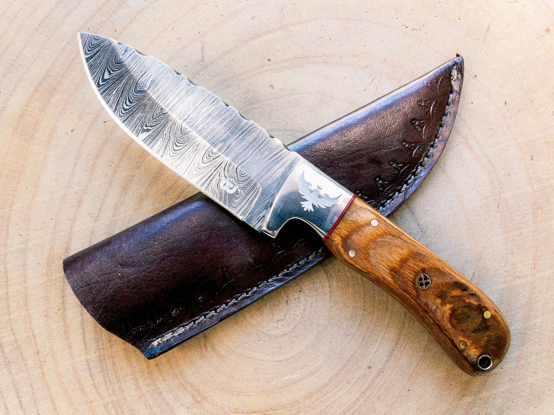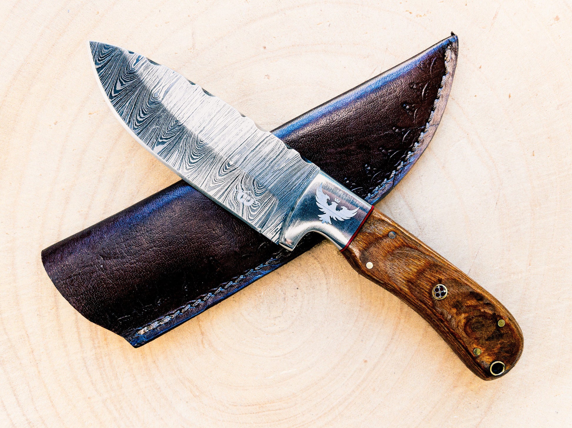Damascus steel has a high carbon content and is prone to rust when exposure to moisture or acidic residue is left un-tended. Immediately after use, wipe down the blade and thoroughly dry (wash with warm water if necessary, but do not use soapy / dishwater), and apply a coat of vegetable oil, coconut oil, or any lubricated oil/vaseline. Store or display in a dry space. Note that for long term storage, the custom leather sheath should not be used. Use the sheath as you carry or transport the knife, but do not leave in the sheath for extended periods of time.