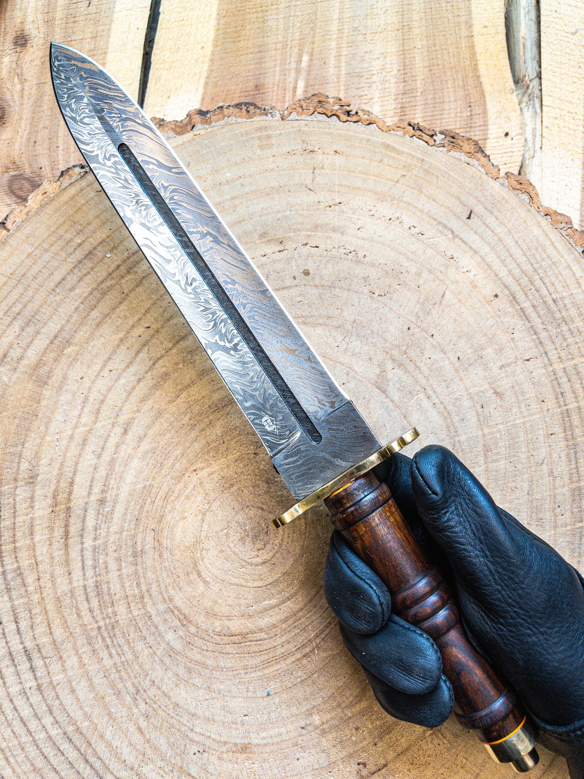 Damascus Short Dagger with Rosewood Handle and Brass Guard