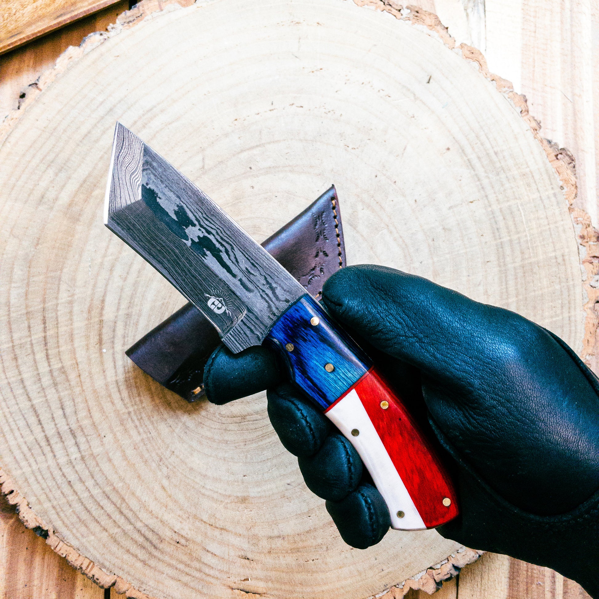 Damascus steel utility / hunting / EDC knife with damascus steel blade, tanto point, red, white and blue freedom micartra wood and bone handle.
