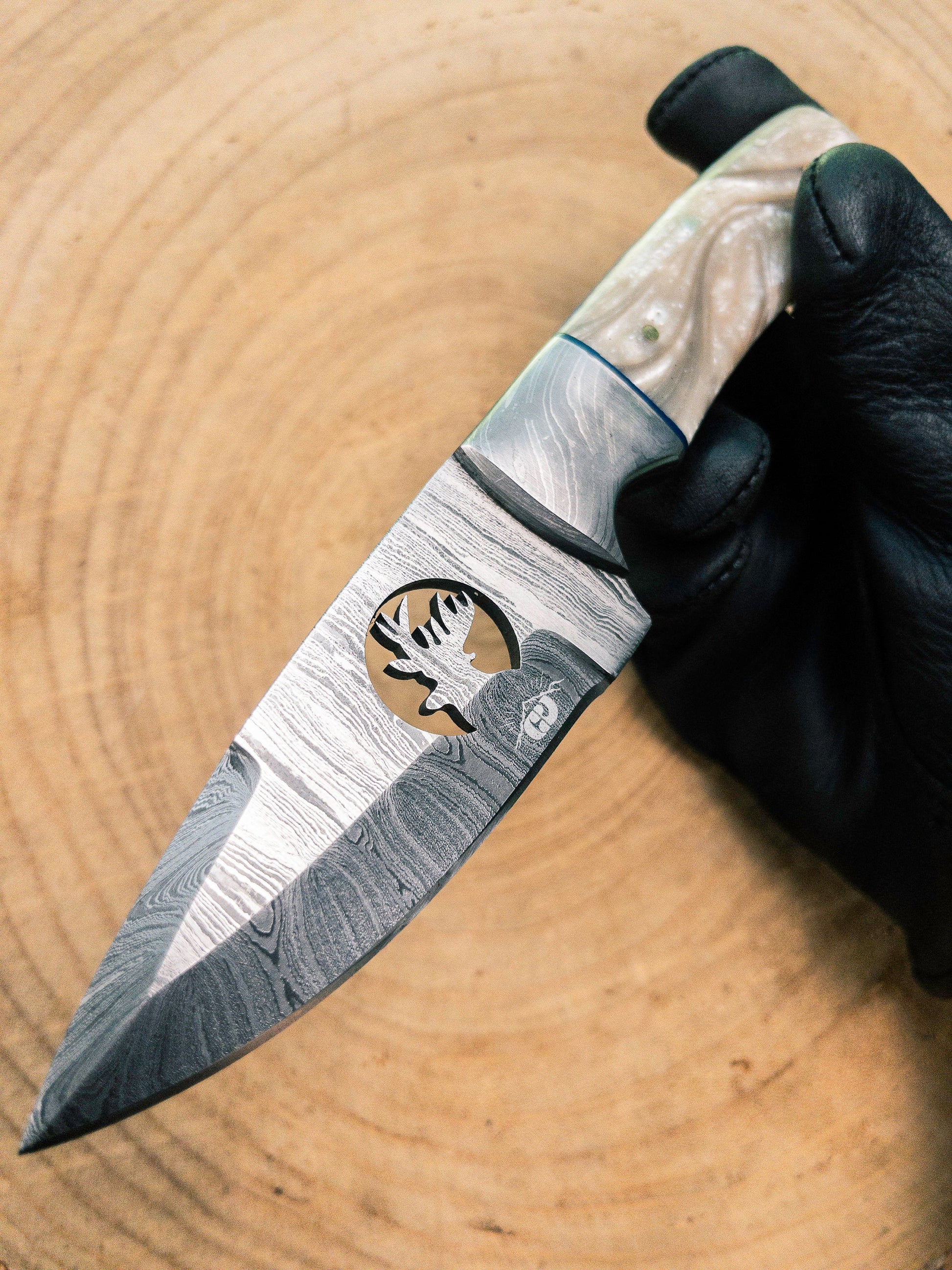 Handle: 4" pearl white resin swirl & Damascus Steel Bolster