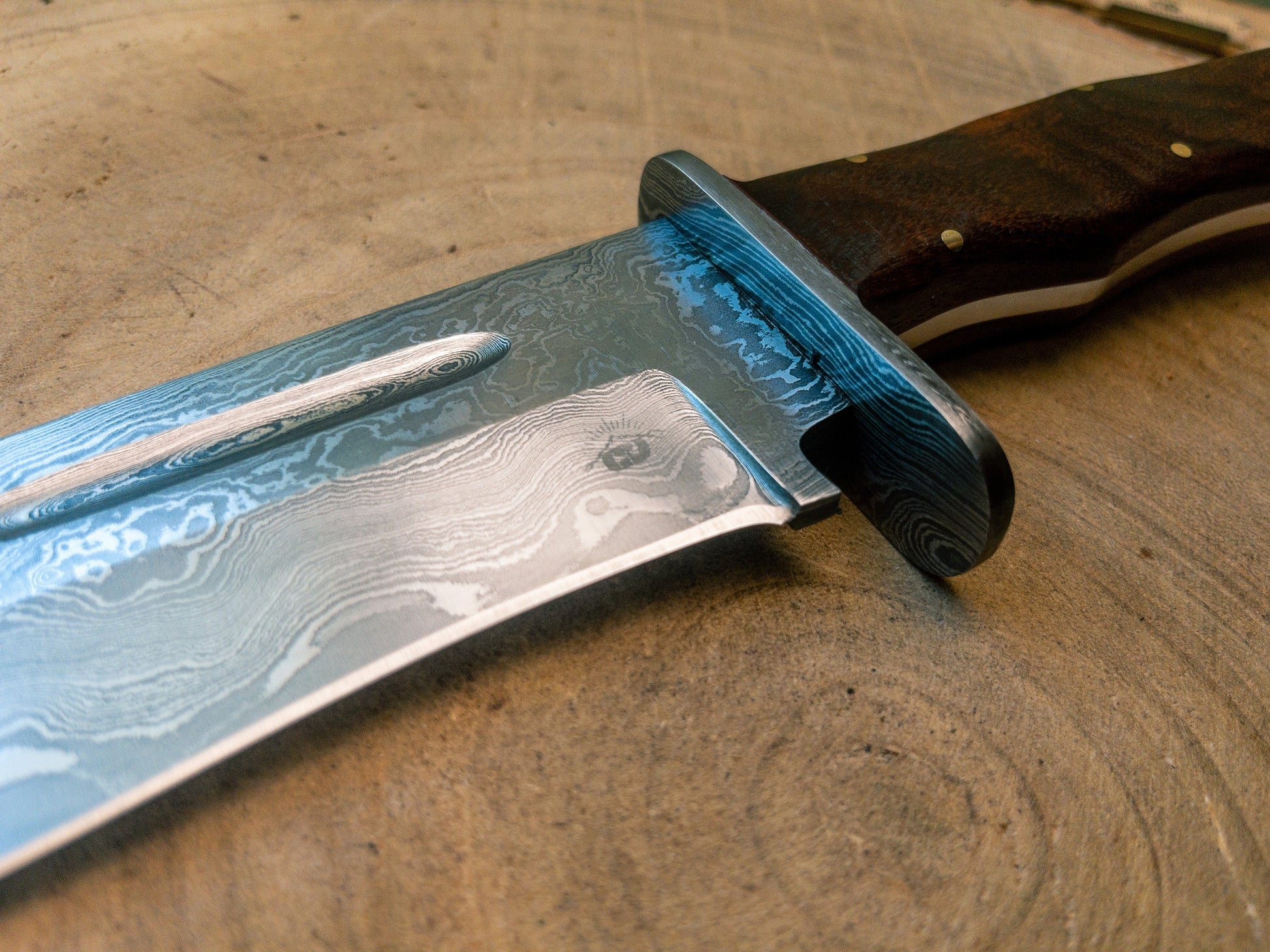 Handmade Bowie hunting knife, crafted with precision and attention to detail. This beautiful knife features a 5.5" rosewood handle with a Damascus bolster clip, providing a comfortable and secure grip in any hunting or outdoor situation.