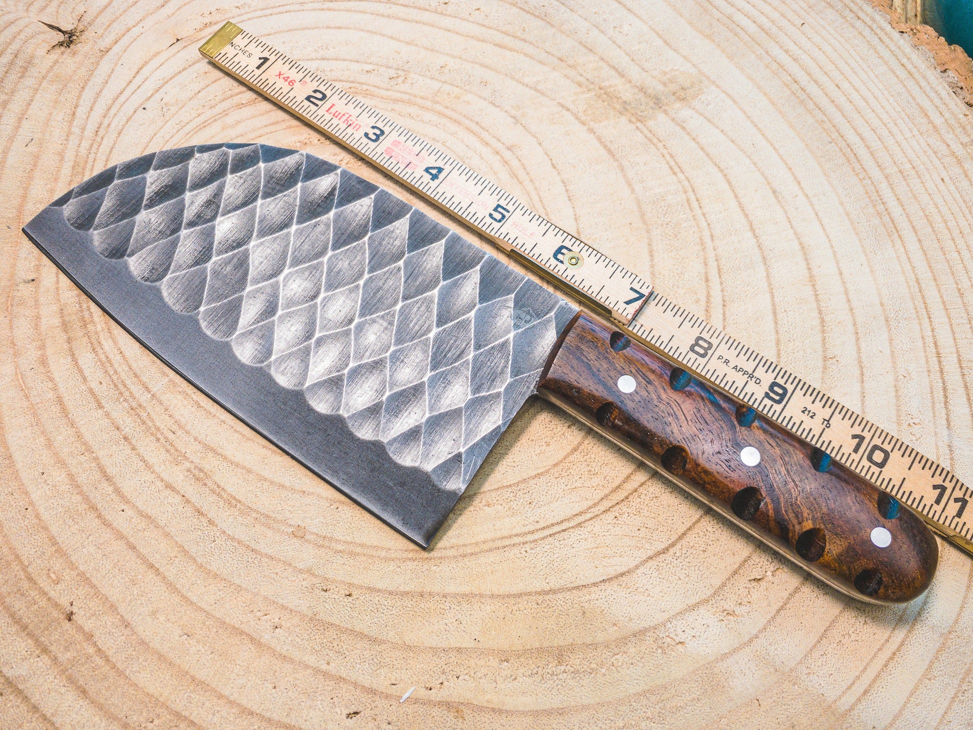 Blade Finish: Hand filed diamond textured blade, grey etch
