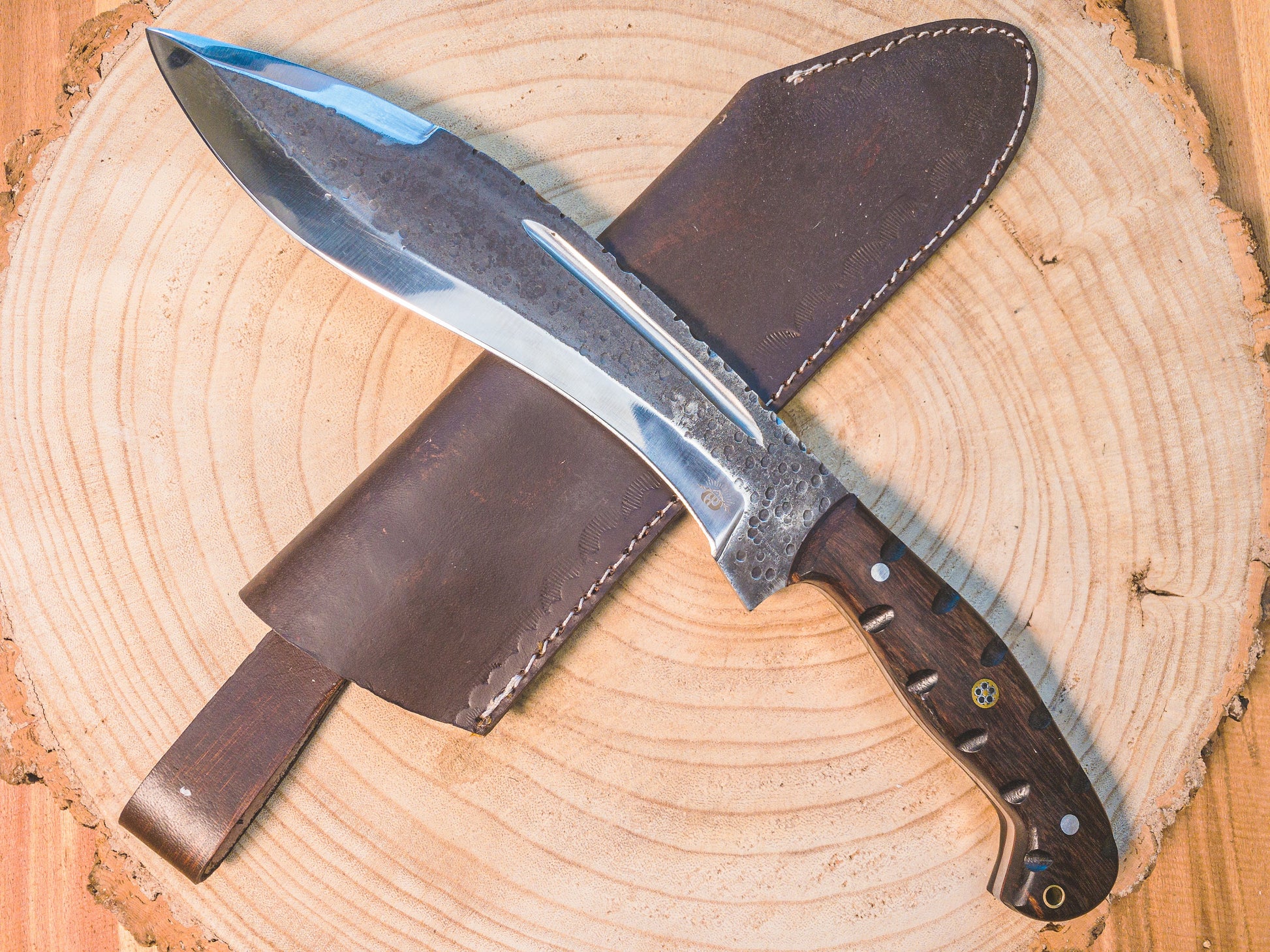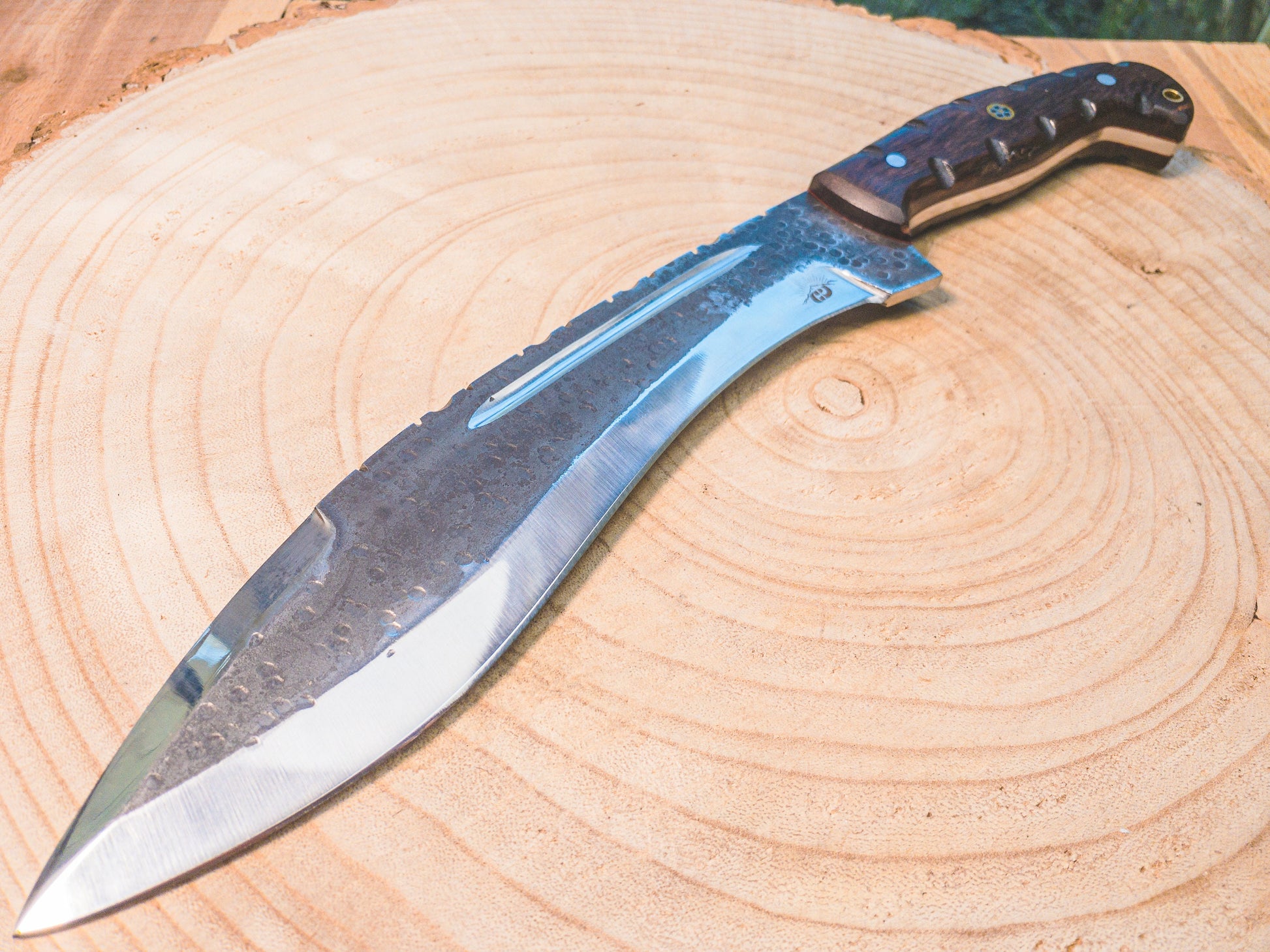 Rugged hand forged hunting kukri knife in 1095 steel, rustic grind finish and grooved blade, black/red tinge micarta handle and custom leather sheath.